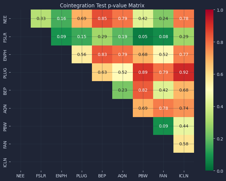 We use seaborn to chart the p-values for all pairs, hiding entries that aren’t meaningful (like the lower half and those above 0.95). Each square shows the exact value, so it’s easy to spot which tickers move alike. The color scale helps us focus on the most promising relationships for strategies or further study.