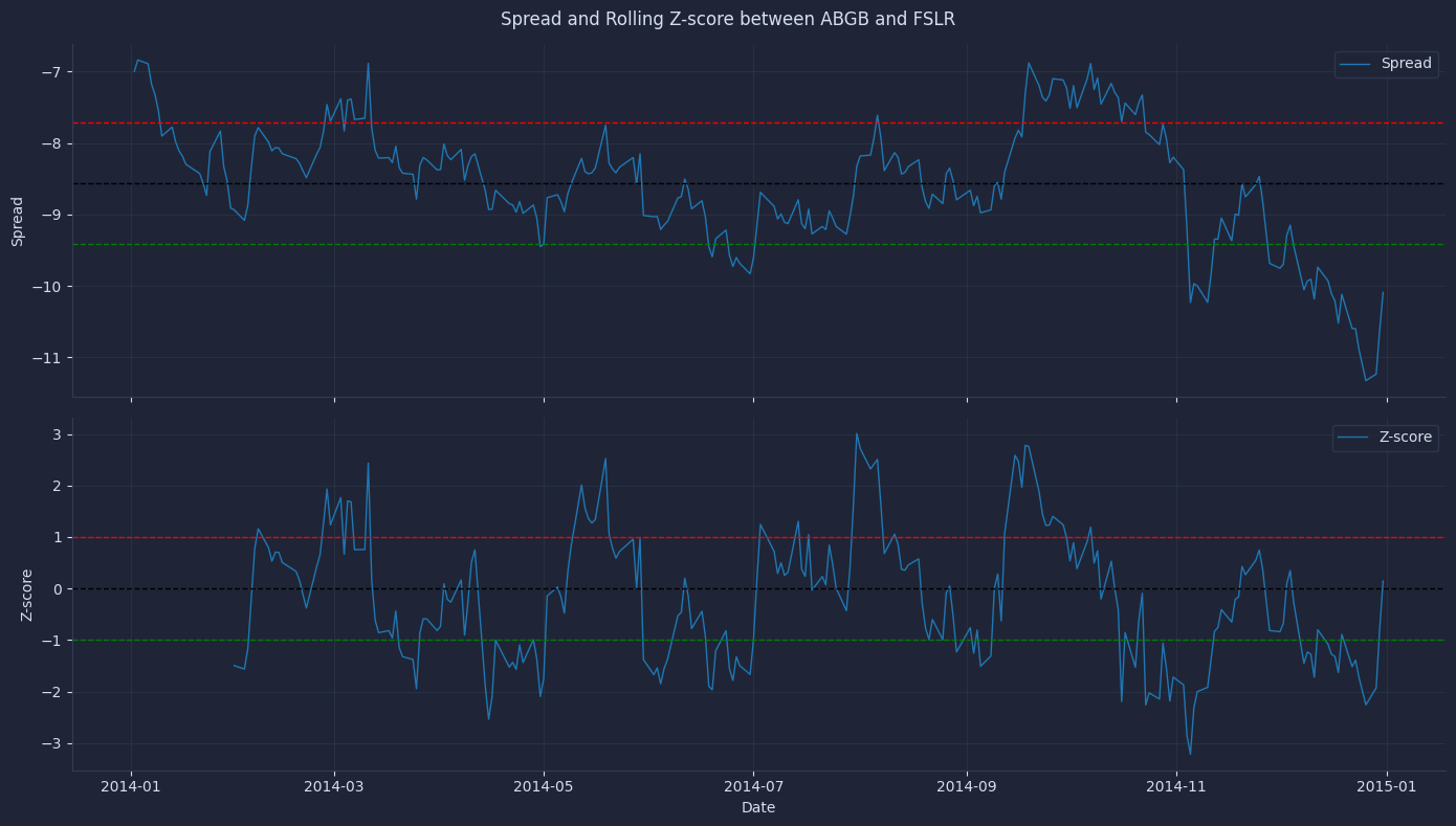 The spread oscillates around its rolling mean and frequently crosses the ±1 Z-score thresholds, indicating repeated mean-reversion opportunities. A trader would buy ABGB and short FSLR when the Z-score falls below −1, expecting the spread to rise back toward zero, and reverse the position (short ABGB, long FSLR) when the Z-score exceeds +1.